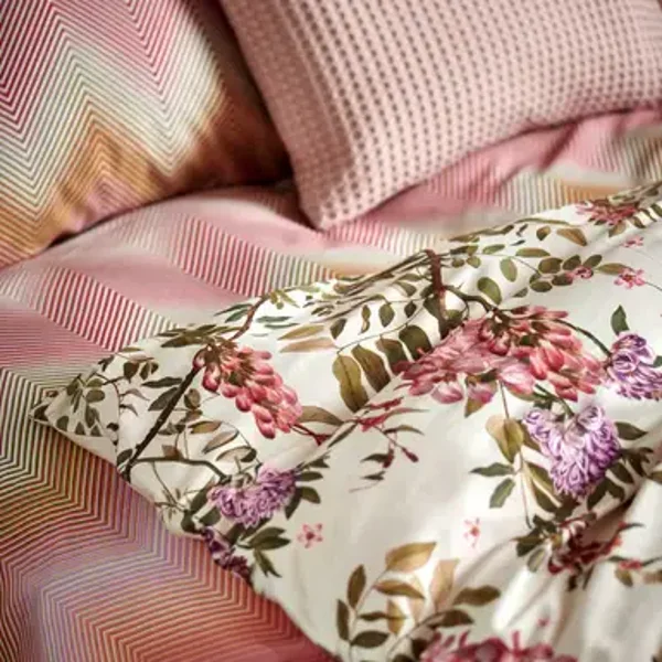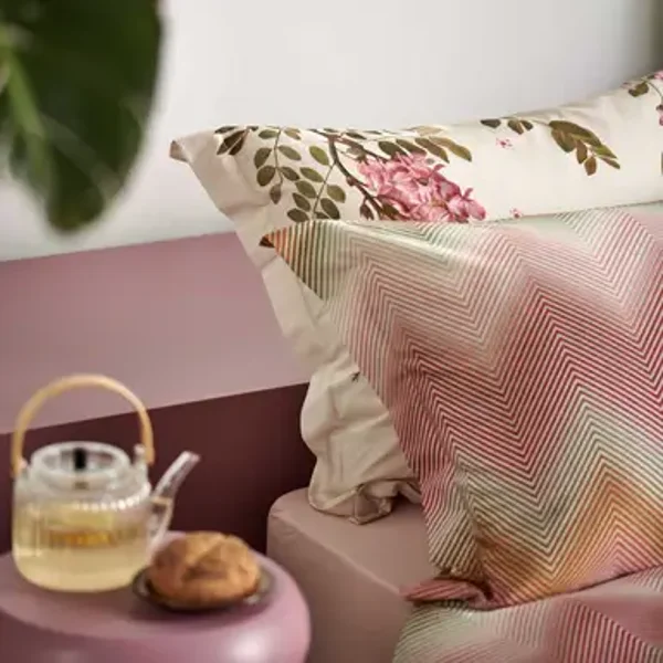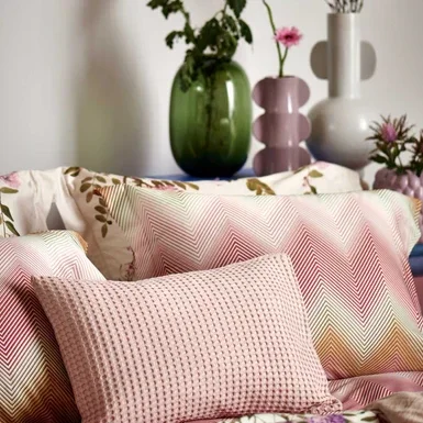 Ziggy pink dekbedovertrek heeft zigzaglijnen in verschillende tinten oranje, roze, blauw en groen. De achterkant van het dekbedovertrek is effen cream tan. De kussens hebben aan beide zijdkanten dezelfde zigzaglijnen. Ziggy pink dekbedovertrek van Vandyck brengt rust en laat de buitenwereld vervagen, alsof je door wazige ramen van de ochtenddauw naar buiten probeert te kijken en alleen vage omlijningen ziet. Dit 100% katoensatijnen dekbedovertrek biedt een luxueuze en comfortabele slaapervaring dankzij de zachte, soepele textuur en ademende eigenschappen. Het speciale weefsel van fijne katoengaren zorgt voor een glad oppervlak en lichte glans. Hierdoor voelt het heerlijk zacht op de huid, wat zorgt voor comfortabel slapen. Bovendien reguleert katoen van nature de lichaamstemperatuur en absorbeert het vocht, wat resulteert in een aangenaam slaapklimaat en goede nachtrust.