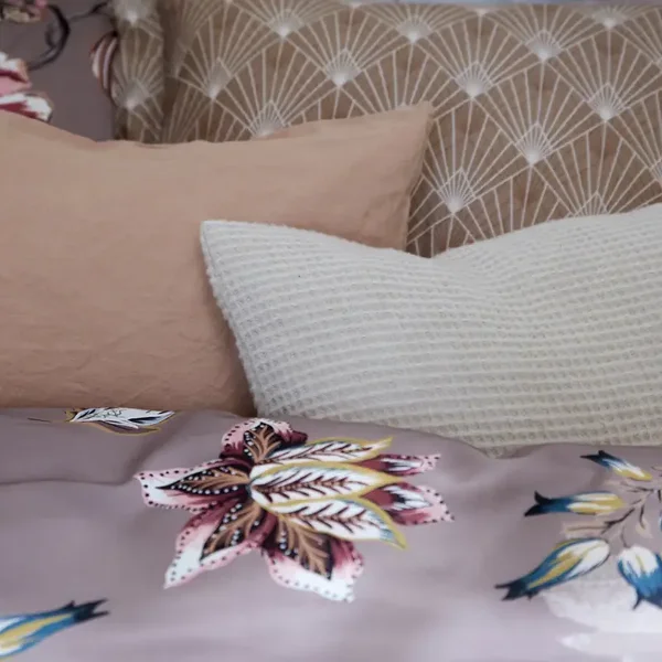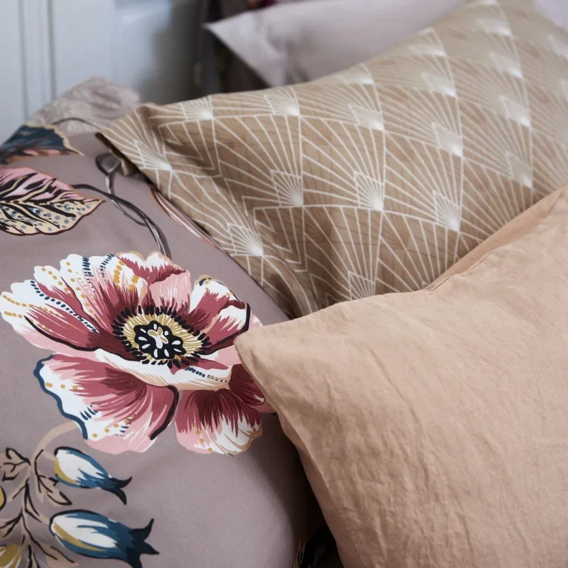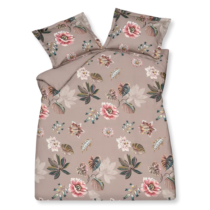 Bloemen kun je nooit genoeg in huis hebben, zeker niet als ze op een mooi dekbedovertrek staan! Roze bloemen in combinatie met bladeren sieren de voorzijde van dekbedovertrekset Eyecatcher. Dit dekbedovertrek heeft de kleur fudge en heeft een effen achterzijde. De print past prachtig bij eindeloos veel interieurs door de velen kleuren die het dessin heeft.