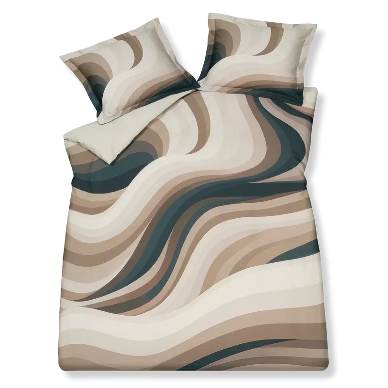 Espresso Lane multi dekbedovertrek heeft golvende lijnen in verschillende tinten beige en bruin. De achterkant van het dekbedovertrek is effen cream tan kleur. De kussens hebben aan beide zijden een gedeelte van het partoon. Door de digitale druk, komt de levensechte print helemaal tot leven. Espresso Lane multi dekbedovertrek van Vandyck heeft een moderne uitstraling die door de golvende lijnen je rustig in wiegt. Combineer met Mirage dekbedovertrek. Dit 100% katoensatijnen dekbedovertrek biedt een luxueuze en comfortabele slaapervaring dankzij de zachte, soepele textuur en ademende eigenschappen. Het speciale weefsel van fijne katoengaren zorgt voor een glad oppervlak en lichte glans. Hierdoor voelt het heerlijk zacht op de huid, wat zorgt voor comfortabel slapen. Bovendien reguleert katoen van nature de lichaamstemperatuur en absorbeert het vocht, wat resulteert in een aangenaam slaapklimaat en goede nachtrust.